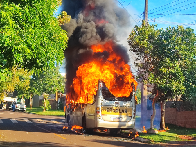 Micro-ônibus escolar é destruído por incêndio em Santa Helena; motorista escapa ileso