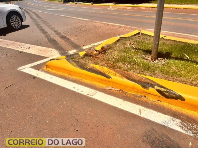 Carreta sobe em meio-fio e causa danos no novo trevo da PR-317 em Santa Helena