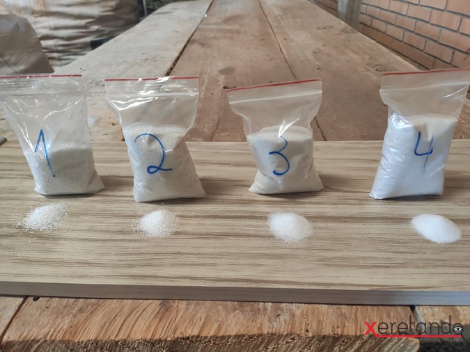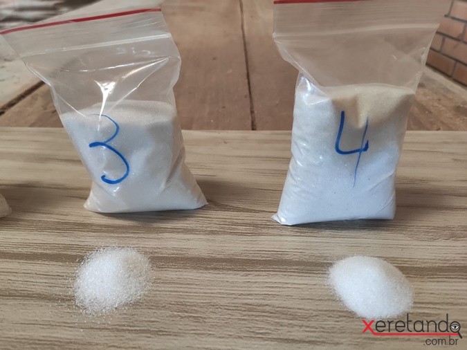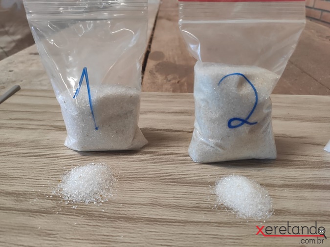 Com o vidro moído, ele passa a se chamar granalha e passa por uma peneira que o divide em cinco granulometrias diferentes.