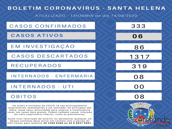 Na tarde desta sexta-feira (14), a Secretaria de Saúde divulgou o novo boletim do Coronavírus, onde aponta que o município conta com 333 casos positivos da doença, sendo considerados casos ativos apenas 06.