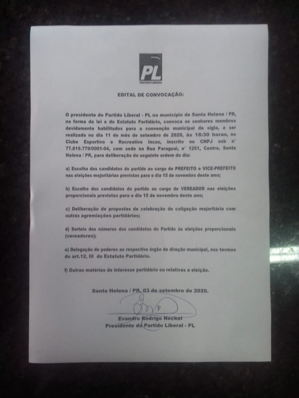 O presidente do PL - Partido Liberal de Santa Helena assinou edital convocando os membros do partido para participarem da convenção que acontecerá no próximo dia 11 ás 18:30 min, no Clube Recreativo Incas, na rua Paraguai, n. 1251 para as deliberação que compõe a ordem do dia.