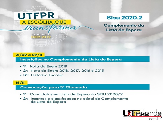 O Complemento da Lista de Espera SISU 2020/2 visa o preenchimento das vagas de cotistas e de não cotistas, não ocupadas nas chamadas anteriores, para ingresso no 2° semestre letivo de 2020, nos cursos de graduação de todos os Câmpus da UTFPR, inclusive o de Santa Helena.