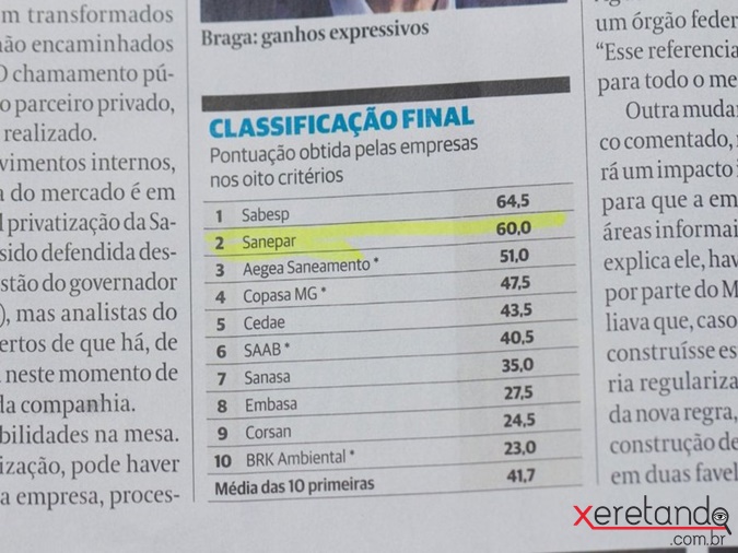 A Companhia de Saneamento do Paraná (Sanepar) é a segunda melhor empresa do país no setor água e saneamento, conforme o ranking Valor 1000 divulgado pelo Valor Econômico nesta sexta-feira (30). O ranking também posiciona a Sanepar entre as 50 maiores empresas do Sul do país.