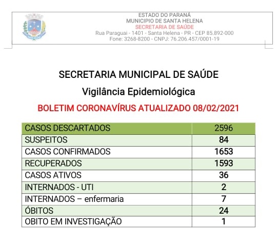 Na tarde desta segunda-feira (08), a Secretaria de Saúde divulgou o novo boletim do Coronavírus, onde aponta que o município está com 1653 casos positivos da doença, sendo considerados casos ativos 36.