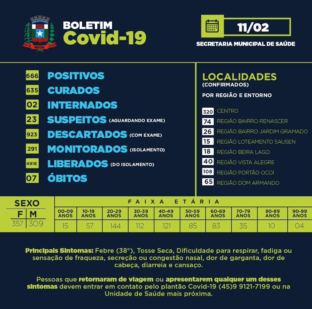 São, portanto, 666 casos positivos no total, 635 curados e 07 óbitos, isso significa que há 24 casos ativos de Covid-19 em Missal, aquelas pessoas que podem transmitir a doença, e deste, 02 estão internados. Há ainda 291 pessoas que devem permanecer em isolamento domiciliar, sendo monitoradas