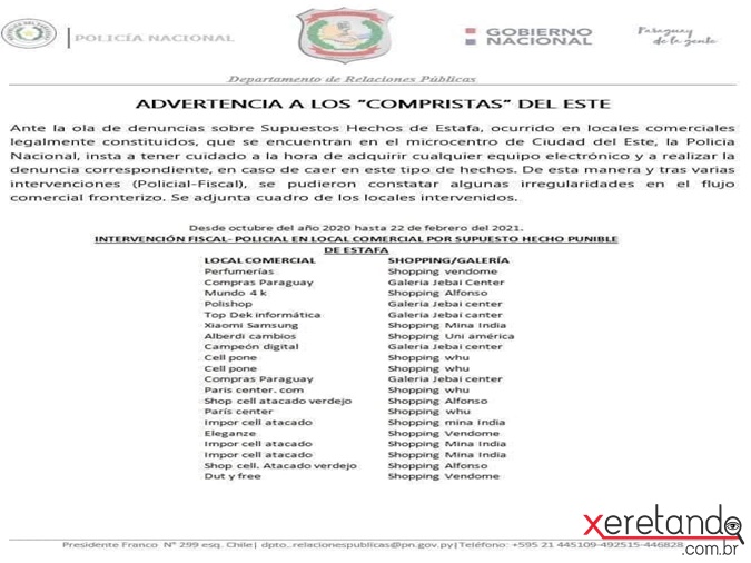 "Diante das denúncias dos supostos casos de fraudes, ocorridos em locais comerciais legalmente autorizados, que se encontram no microcentro de Ciudad del Este, a Polícia Nacional pede para ter cuidado na hora de adquirir qualquer equipamento eletrônico e fazer a denúncia para as autoridades competentes, em caso de cair nesse tipo de fraude. Desta maneira e diante de várias intervenções fiscais, foi possível constatar algumas irregularidades no fluxo comercial fronteiriço. Abaixo, a relação dos locais interitados", diz a nota.