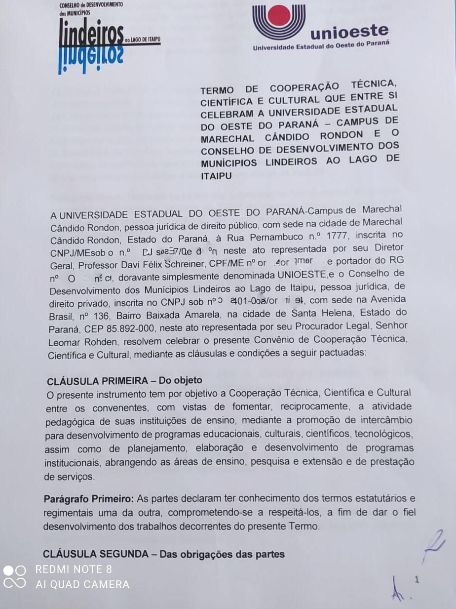 Um termo de cooperação técnica entre o Conselho de Desenvolvimento dos Municípios Lindeiros ao Lago de Itaipu e a Universidade Estadual do Oeste do Paraná (Unioeste), assinado recentemente, possibilitará um trabalho conjunto em ações regionais. A parceria visa atender demanda oriundas, tanto do poder público, quanto da população.