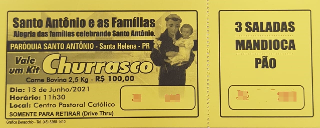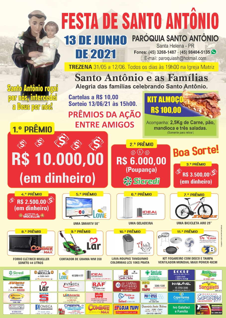 A comunidade católica de Santa Helena informa que as cartelas da ação entre amigos e fichas do almoço da festa do Padroeiro Santo Antônio que será realizada no dia 13 de junto ja estão à venda.