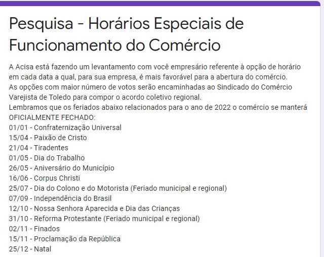 Para estas definições é feita uma consulta às associações comerciais da região. A Associação Comercial e Empresarial de Santa Helena (Acisa) também busca a sugestão dos associados para, a partir das respostas, encaminhar as sugestões ao sindicato, conforme a secretária executiva da entidade, Dayane Passos.