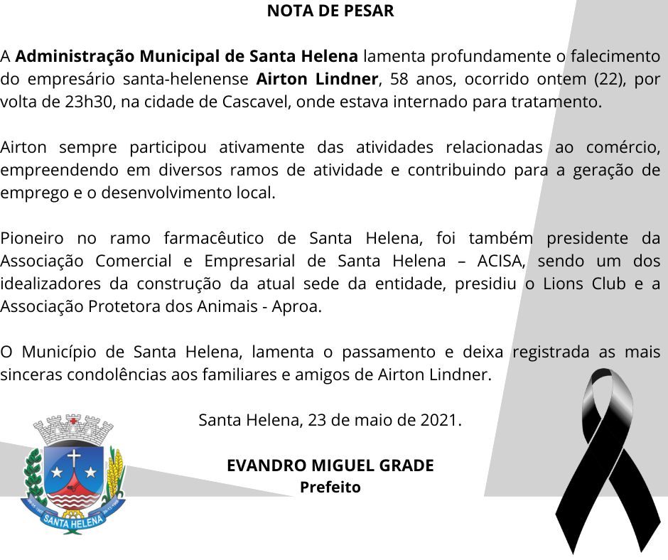 Município emite Nota de Pesar pelo falecimento de Airton Lindner