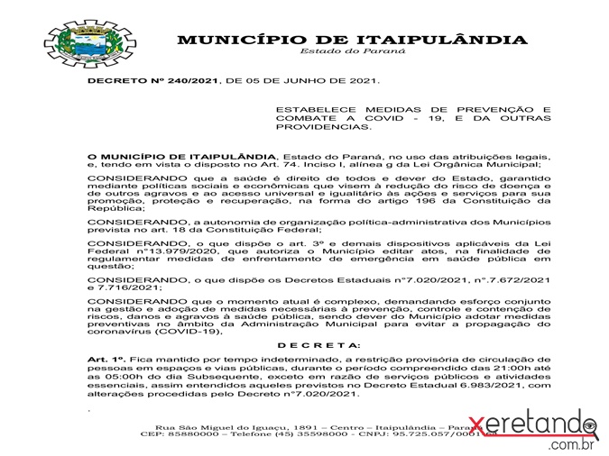De acordo com dados apresentados, a Ala Covid do HMI está lotada e os casos de Covid-19 não param de aumentar, sendo necessária a adoção de medidas para conter o avanço da doença. O Decreto 240/2021 vale a partir da data da sua publicação. Acompanhe: