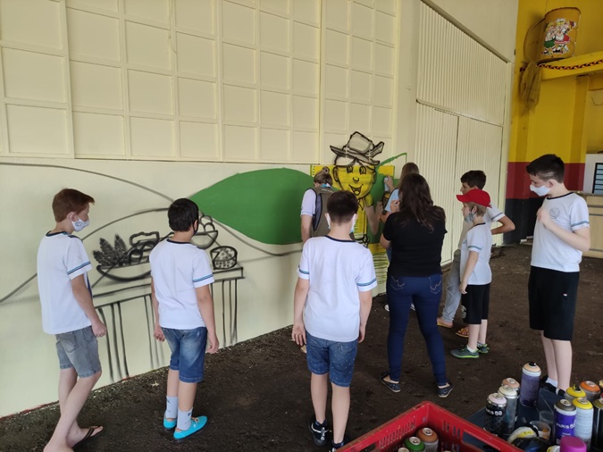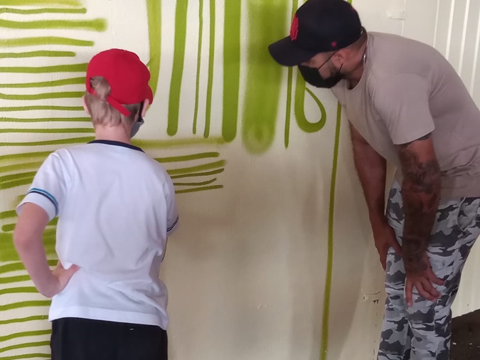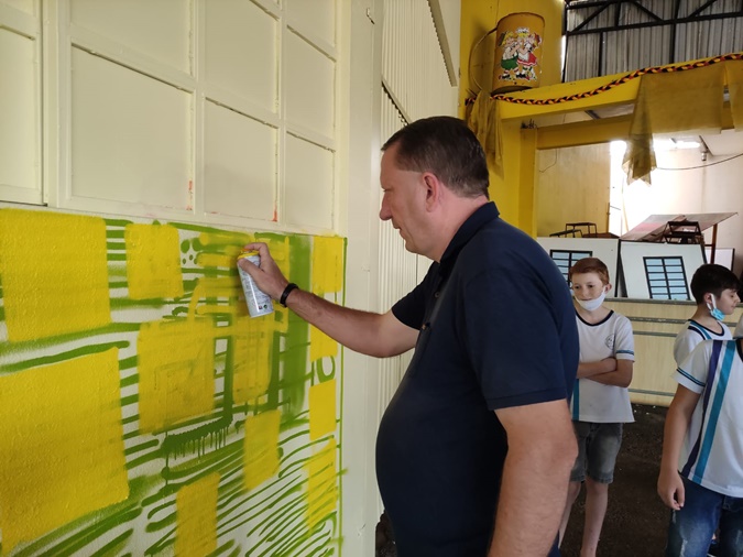 O vice-prefeito Chenho acompanhou as informações repassadas e colocou a mão na massa... digo, na lata de tinta! A oficina visa despertar a consciência ambiental com base em manifestações artísticas. Precisamos diferenciar, pichação, que é um ato de vandalismo, do Graffiti, que é uma obra de arte e que deixa os locais, as cidades muito mais coloridas e alegres. Foram apresentados ainda os tipos de bicos para as latas e sua utilidade. Os alunos puderam tirar dúvidas.