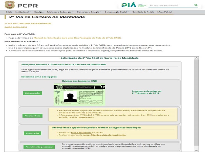 O acesso pode ser feito pelo site da Polícia Civil do Paraná, em serviços, opção Documentos e 2ª via da Carteira de Identidade, ou no quadro de Serviços, opção 2ª Via. O interessado deverá digitar o número do documento e alguns dados.