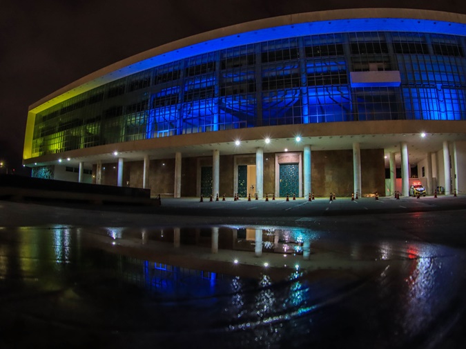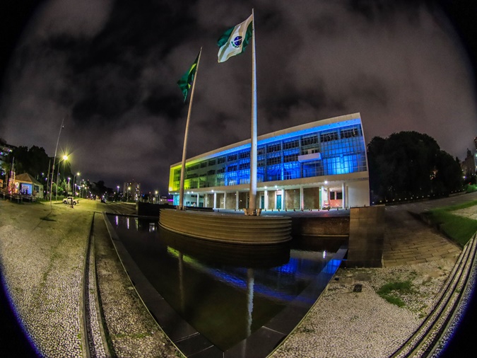 A partir da noite desta quinta-feira (03), o Palácio Iguaçu, sede do Governo do Paraná, será iluminado com as cores da bandeira da Ucrânia. O azul e o amarelo, projetados na fachada, também colorem monumentos, prédios públicos e representações diplomáticas do mundo inteiro.