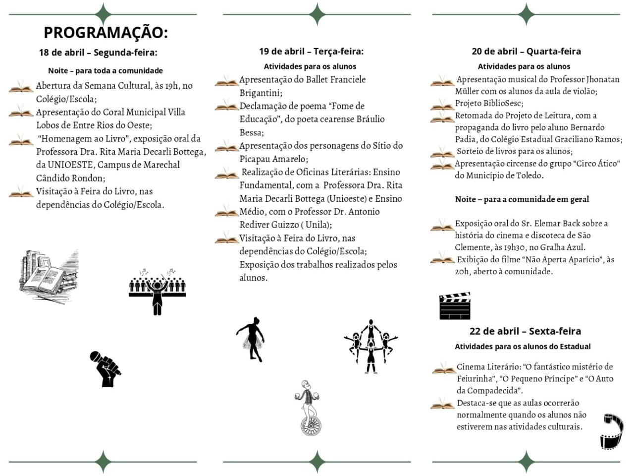 Para hoje estão programadas atividades de apresentações musicais; retomada do Projeto de Leitura, com a propaganda do livro pelo Aluno Bernardo Padia do Colégio Estadual Graciliano Ramos; sorteio de livros para alunos e apresentação circense do Grupo “Circo Ártico” do município de Toledo.