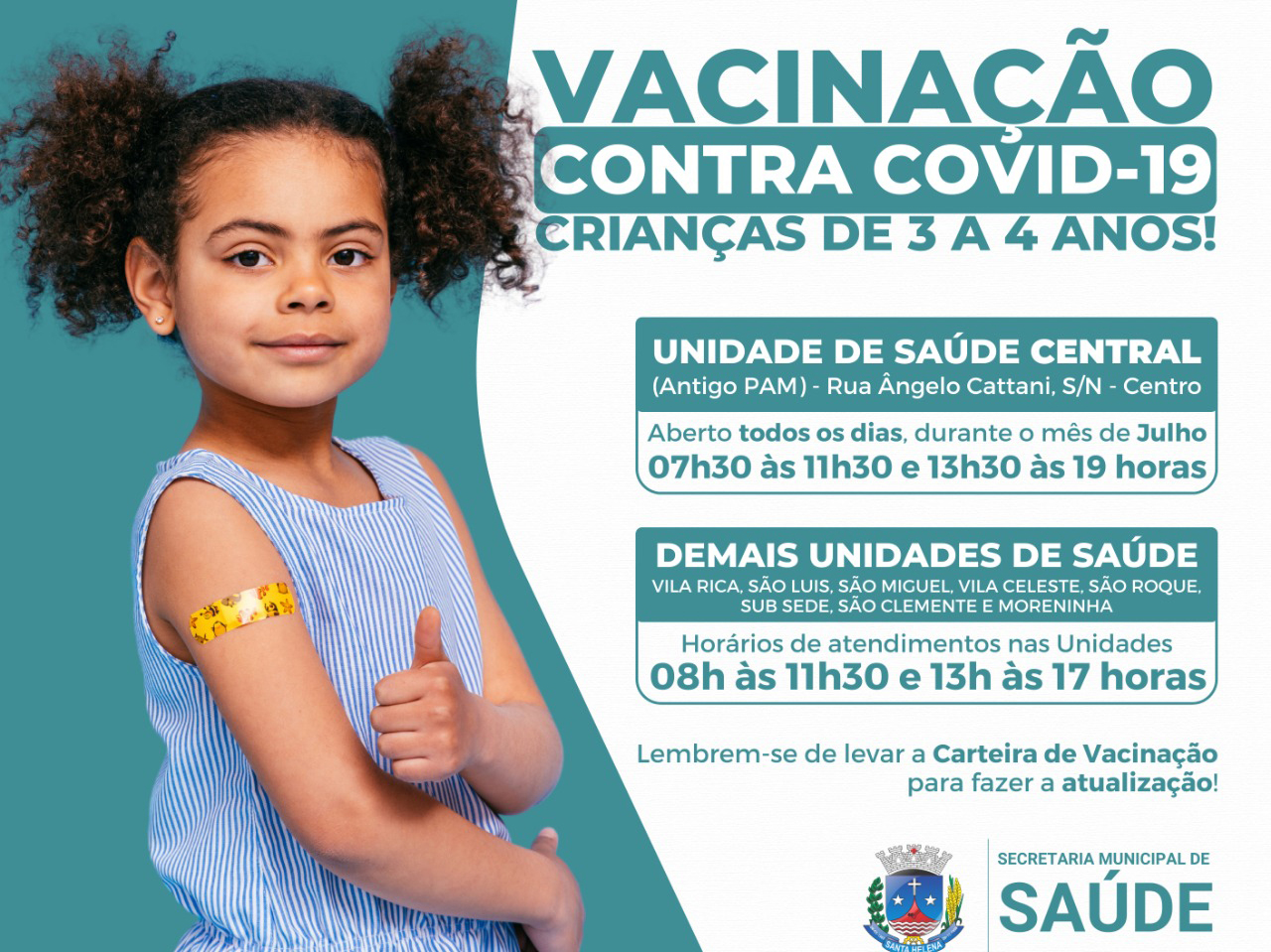 Iniciou na terça-feira (26) a vacinação em crianças com idade entre 3 e 4 anos em Santa Helena. Seguindo a recomendação do Ministério da Saúde, a vacina está disponível nas Unidades Básicas de Saúde da Sede e Distritos.