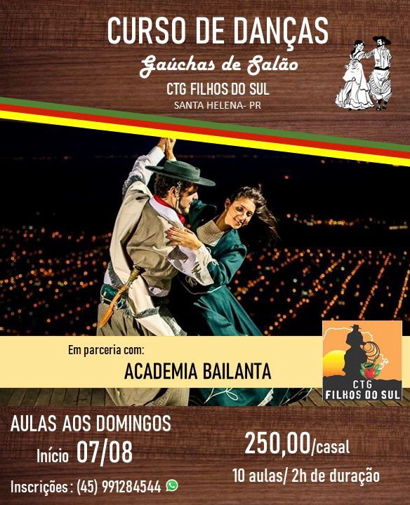 O CTG Filhos do Sul de Santa Helena está promovendo um curso de danças gaúchas de salão, o curso será realizado em parceria com a Academia Bailanta.