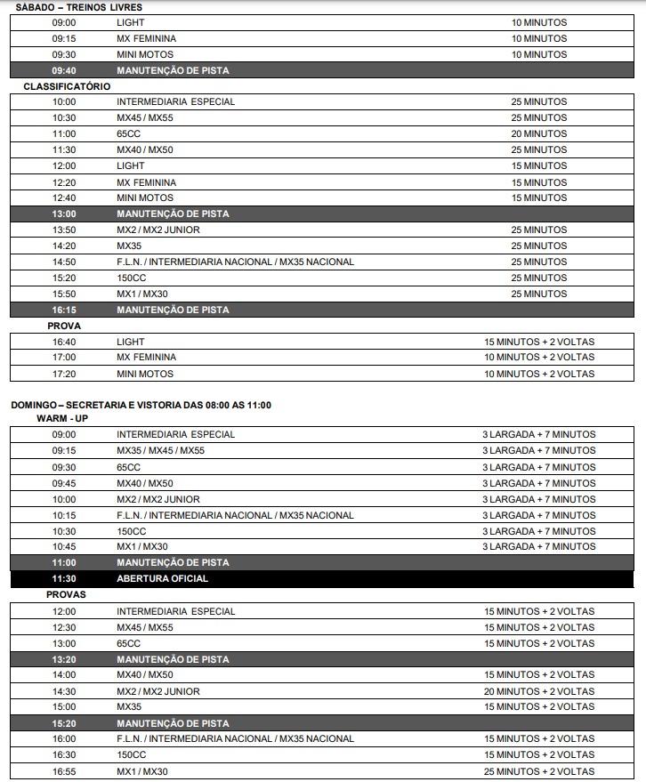 No sábado (26), a partir das 9h começam as tomadas de tempo, que vão até às 16h. No final da tarde já começam as provas, com a Light, Mx Feminina e Mini Motos, a partir das 17h. A partir das 9h de domingo, começa o Warm Up e a abertura oficial do evento se dará às 11h30.