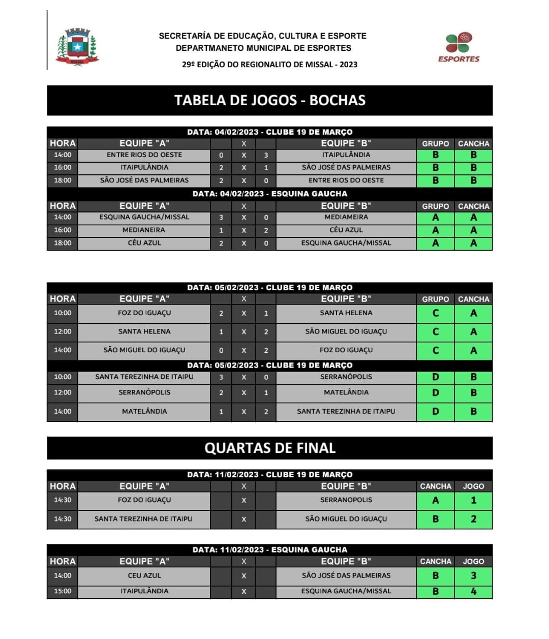 A equipe representante de Missal, Esquina Gaúcha, atual campeã municipal de Bocha, conquistou classificação para as quartas de final e enfrenta a equipe de Itaipulândia no sábado, 11 de fevereiro na Cancha em Esquina Gaúcha. Também haverá disputas nas cachas do Clube 19 de Março.