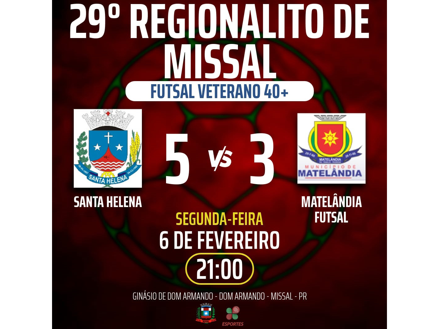 O Matelândia reagiu e empatou após Vanderlei Mossner e Jaime Bozio marcarem: 3x3. Na reta final da partida Jairzinho voltou a marcar e colocou Santa Helena à frente do placar mais uma vez: 4x3. Sandro Barth fez e deu números finais ao jogo: 5x3.
