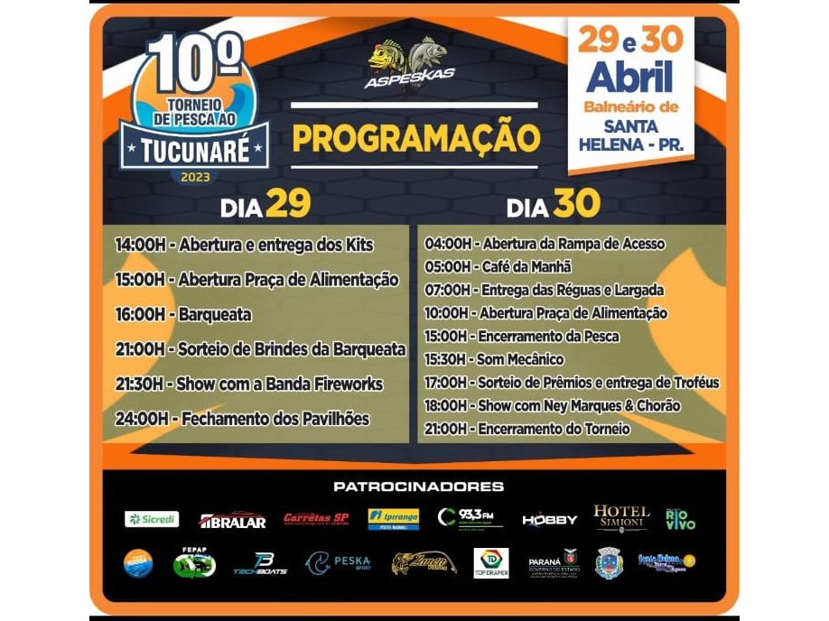 O 10º Torneio de Pesca ao Tucunaré de Santa Helena é uma realização do município de Santa Helena em parceria com a Associação de Pesca Esportiva Kai&Sara (Aspeskas), e consiste da modalidade ‘pesque e solte’.