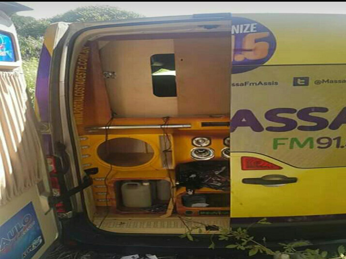 Segundo as informações, a van ficou parcialmente destruída, e alguns equipamentos de som foram levados.