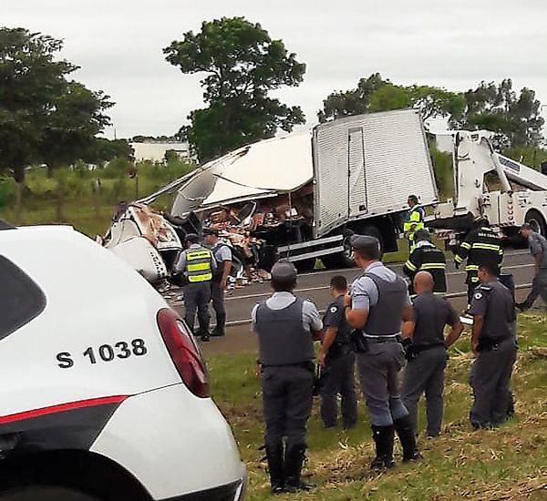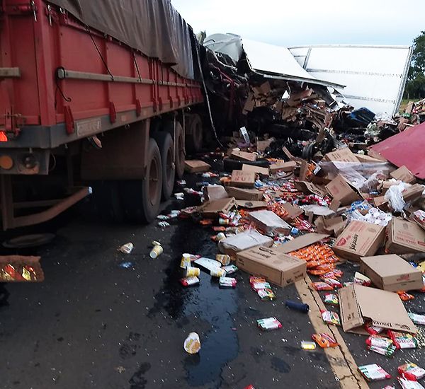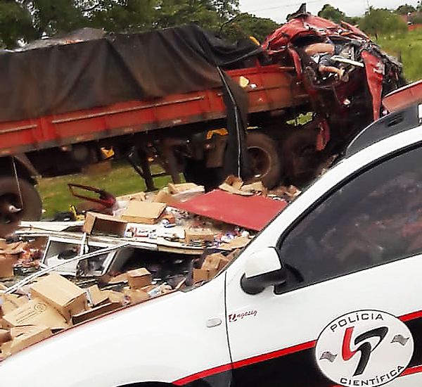 cabines dos dois veículos ficaram completamente destruídas. Assim como o baú do