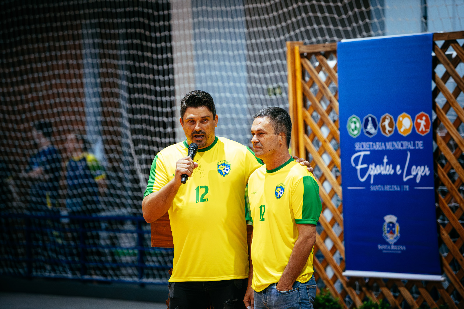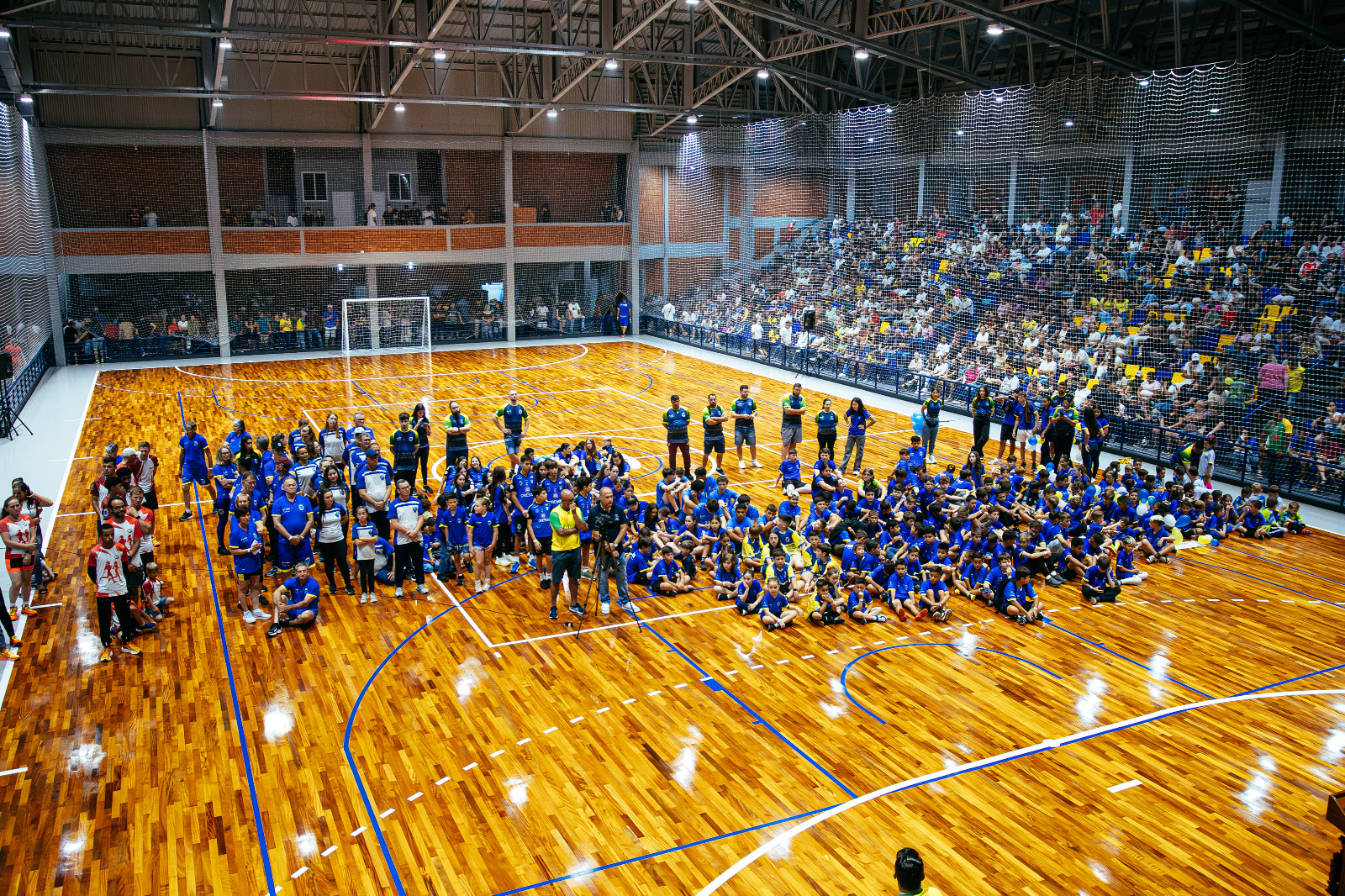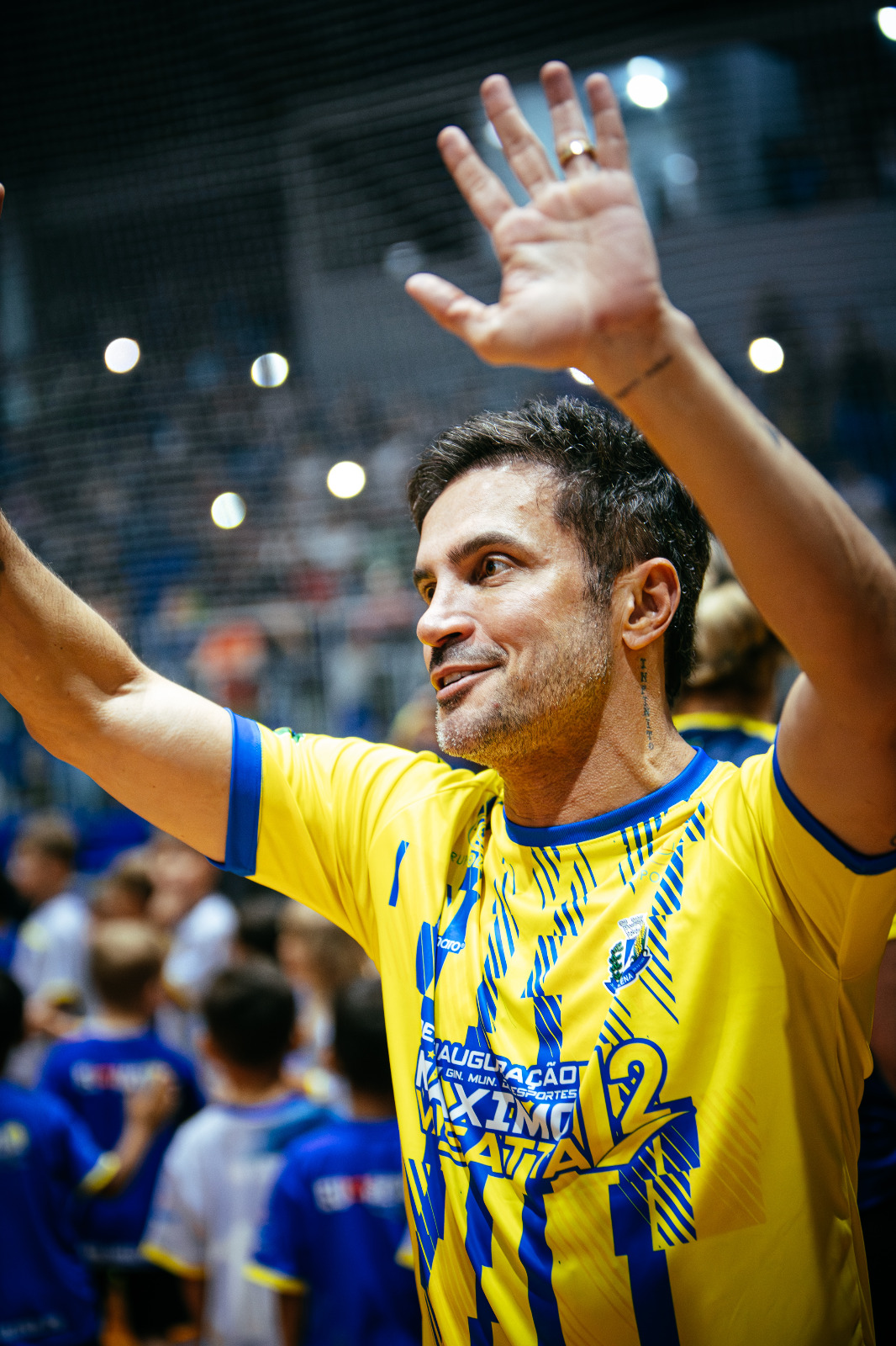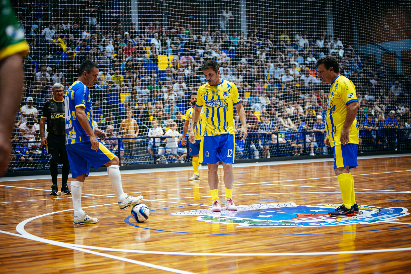 JOGO FESTIVO - A programação da noite contou com a participação de crianças e adolescentes das escolinhas municipais e distritais, que representaram diferentes modalidades esportivas. O ponto alto foi o jogo festivo com o time do craque Falcão e contra a equipe Vasatta, formada por familiares e atletas ligados à história do esporte local. O público acompanhou lances e interações com o ídolo do futsal, celebrando a reabertura do ginásio como a principal casa do esporte, da convivência e da família em Santa Helena.