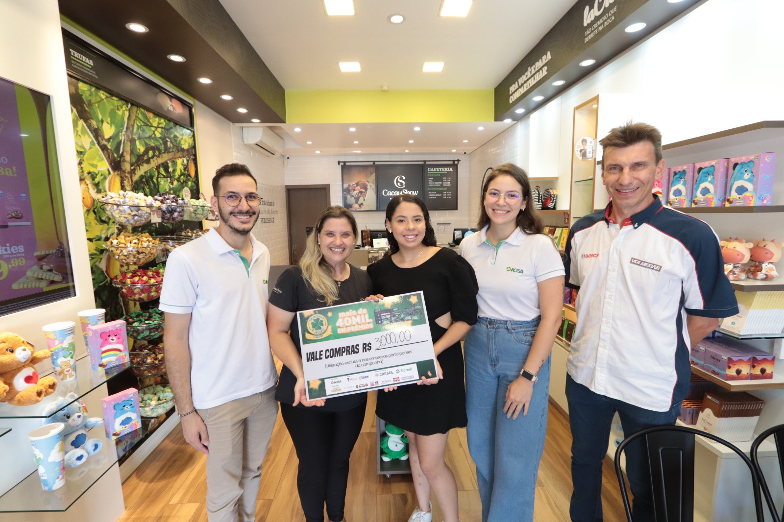 Também foram entregues vales-compras em diferentes valores. O prêmio de R$ 3.000,00 saiu para Pietra Lauana dos Santos Oliveira, que comprou na Cacau Show. Os vales de R$ 1.000,00 contemplaram Alexandra Kaiser, cliente do Supermercado Santa Helena; Arthur José de Brito e Querlinde Ires Scheidt Scheeren, ambos com compras realizadas na Foto Íris; Leonardo Luiz Uberti Redin, da Farmácia Real; Verani Koch, da Bellabeloka Brinquedos; e Denise Aparecida Zapani, da MBM Calçados.