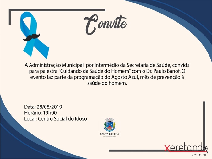 A Secretaria Municipal de Saúde convida a população para a palestra “Cuidando da Saúde do Homem” com o médico Paulo Banof, que irá explicar e orientar os presentes sobre cuidados e prevenção na saúde masculina. O encontro será na próxima quarta-feira (28), às 19h, no Centro Social do Idoso.