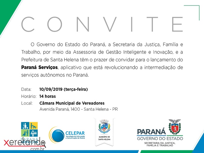 Através de uma parceria do Município com o Governo do Estado, por meio da Secretaria de Justiça, Família e Trabalho e Celepar, será lançado na próxima terça-feira, às 14h na Câmara de Vereadores um aplicativo para Android e IOS chamado de Paraná Serviços que atua como intermediador de mão de obra.