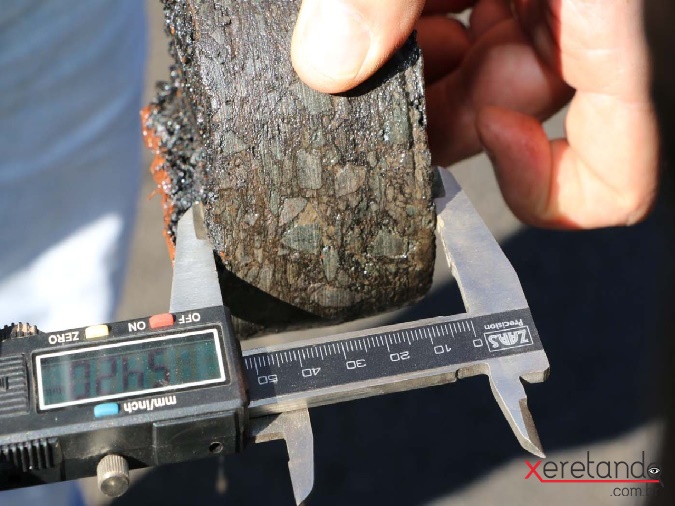 A sondagem, como é chamada, ocorre na companhia dos representantes das empresas responsáveis, que utilizando uma trena e também uma furadeira motorizada, medem e retiram amostras do asfalto verificando-as com o uso de um paquímetro que serve para aferir e a espessura e, na sequência, elas são enviadas para análise para quantificar o conteúdo existente, certificando-se assim, da durabilidade do material. De acordo com o contrato, a espessura não pode ser menor do que quatro centímetros, já a largura, varia de acordo com cada trecho executado e é confrontada com as especificações técnicas existentes, também no contrato.
