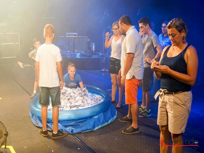 Primeiramente, foram convidadas oito crianças que estavam na plateia para retirar os cupons que foram acondicionados em uma piscina infantil.