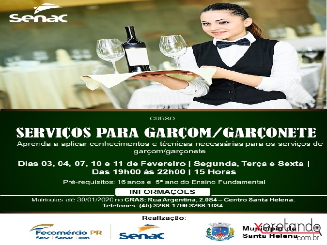 O Programa Bolsa Família, do município de Santa Helena, está com está com as inscrições abertas para o curso de garçom/garçonete exclusivamente para as pessoas que recebem o Bolsa Família ou possuem o Cadastro Único.