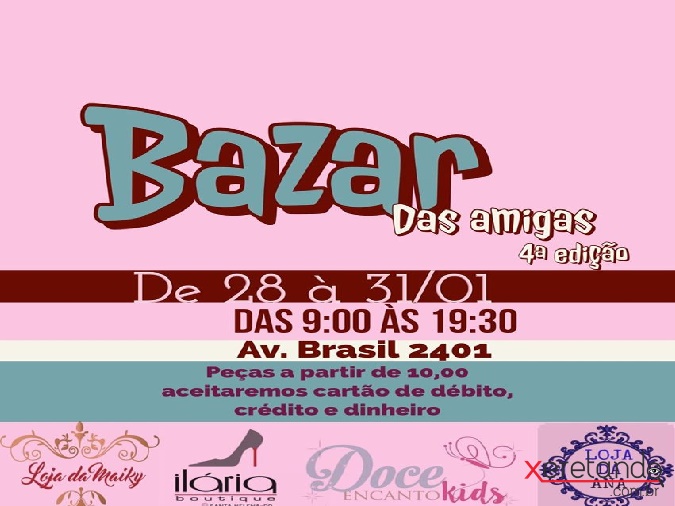 Bazar das Amigas, de 28 á 31 de janeiro. Na Av. Brasil, nº 2014, ao lado da Gráfica Benacchio.