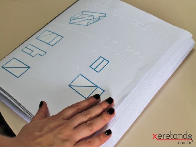 Para as provas de Matemática, além da descrição em Braille, foram produzidas formas geométricas em alto-relevo. Miria explica que se trata de um trabalho artesanal que utiliza materiais como linha, barbante e folhas de espuma vinílica acetinada (EVA).