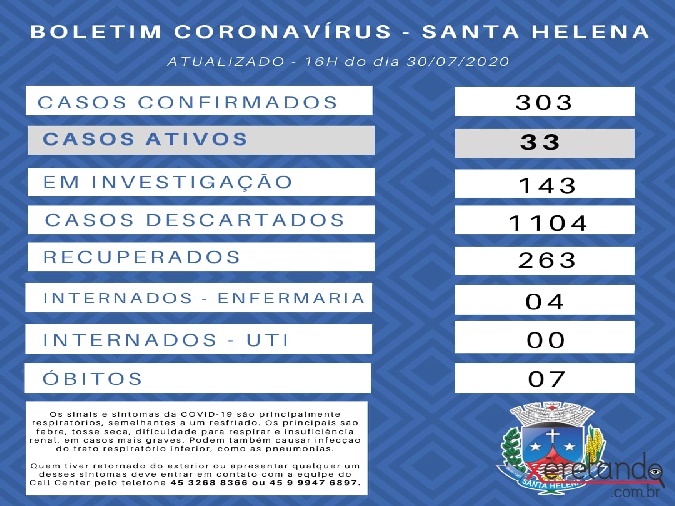 Santa Helena tem 263 casos recuperados da Covid e apenas 33 ativos
