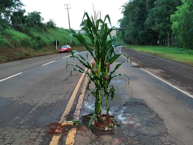 Em protesto aos buracos na PR-491, homem planta pés de milho no meio da rua