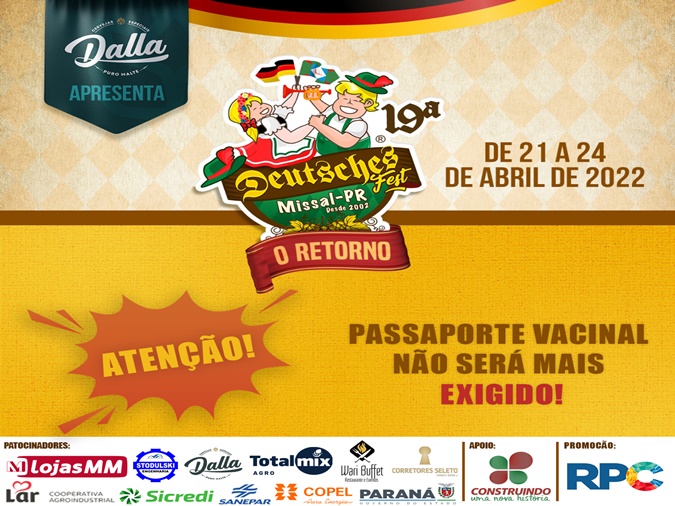 Passaporte Vacinal NÃO será mais obrigatório para 19ª Deutsches Fest de Missal