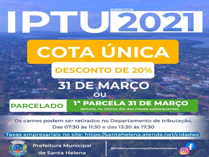 Com desconto de 20%, pagamento à vista de IPTU 2021 pode ser feito até quinta-feira em Santa Helena